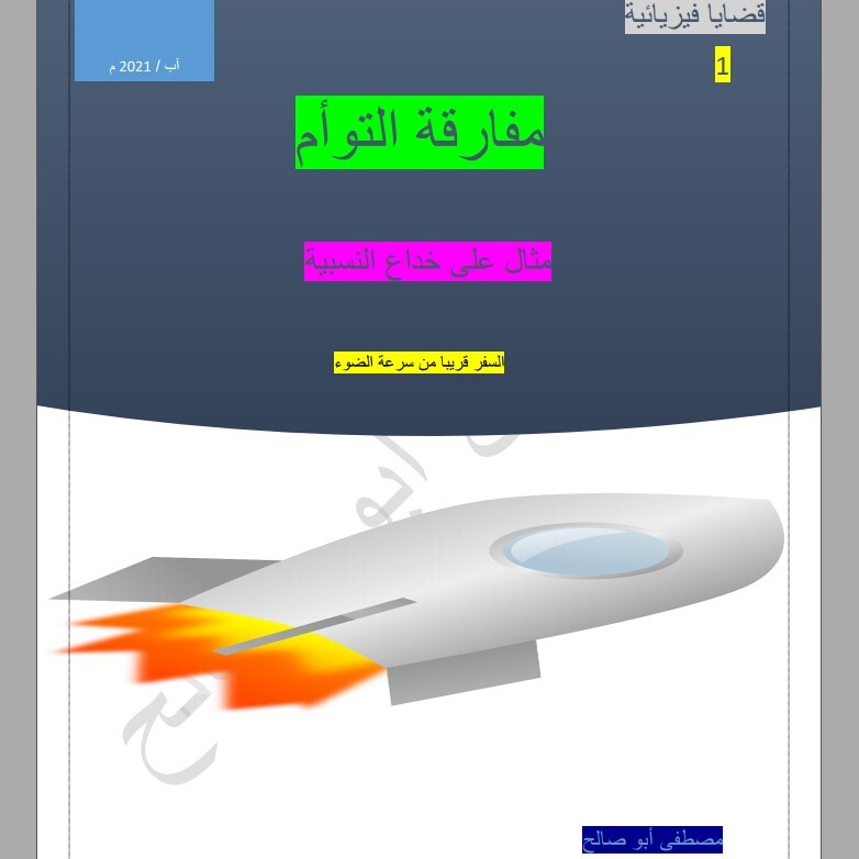 في هذا الكتاب رحلة شيقة لأحد توأمين يسافر بسرعة مستقيمة منتظمة قريبة من سرعة الضوء ويترك أخاه التوأم على الأرض ليعود إليه بعد عدة سنوات ليجده أكبر منه سنا بسبب تأخر الزمن الذي يتعرض له التوأم المسافر ولأن النسبية الخاصة لا تفرق بين التوأمين الساكن والمتحرك بسرعة مستقيمة منتظمة فكل منهما يرى ساعة الآخر تؤخر بنفس القيمة فلا يحدث اي فارق في العمر بينهما مما يسبب مفارقة بضياع الحقيقة بين التوأمين ففسر هذا الفارق الزمني بالتسارع الذي يتعرض له المسافر في الذهاب والإياب حيث يكافىء هذا التسارع حقل جاذبي حقيقي يسبب تأخر الزمن عند التوام المسافر وفي هذا الكتاب سنرى أن هذا غير صحيح وأن الفارق يمكن أن يحدث خلال فترة السرعة المستقيمة المنتظمة ذهابا وإيابا ولكن بالتخلي عن النظرة النسبية التي تساوي بين السكون والحركة المستقيمة المنتظمة هذا التساوي المستند فقط إلى الشعور الوهمي للتوأم المسافر بأنه ساكن وأن اخيه هو المتحرك بالنسبة له بنفس السرعة وعكس الاتجاه.